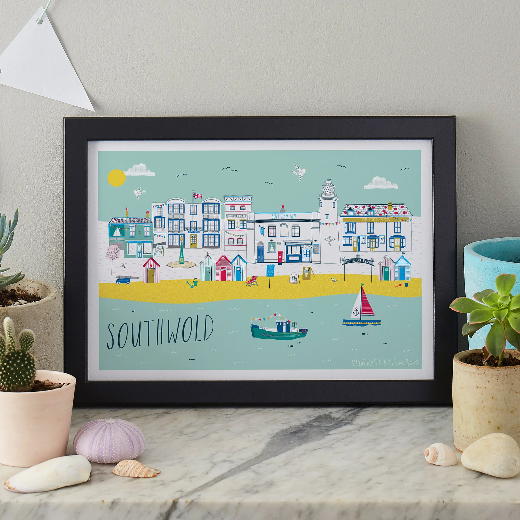 Jessica Hogarth Southwold print available in A4 size. This design includes the famous Swan Hotel, Lord Nelson pub, Sole Bay in and the Lighthouse.